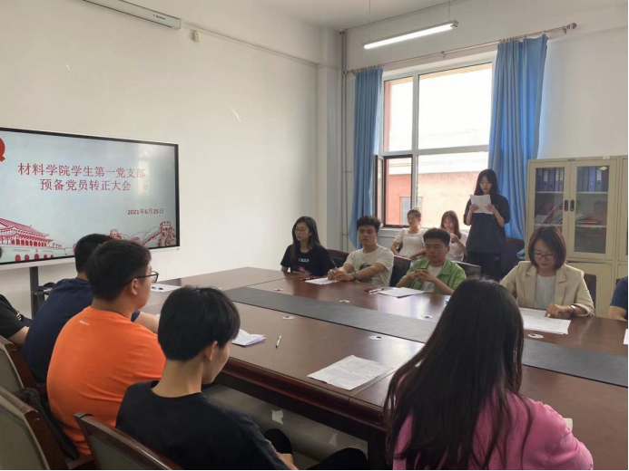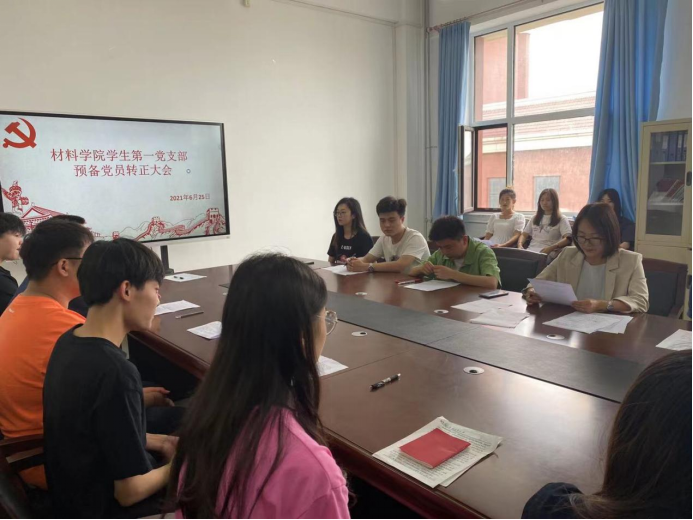 2021年6月25日yl9193永利集团学生第一党支部于材料楼425会议室召开转正大会。本次大会由党支部书记李爽主持,对颜榕等7名同志是否能如期转正进行讨论和表决。