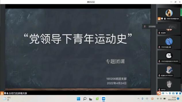 2022年史党的二十大召开之年,也是建团100周年。200205团支部于2022年4月23日下午13点在腾讯会议开展了党领导下的青年运动史主题团课学习。