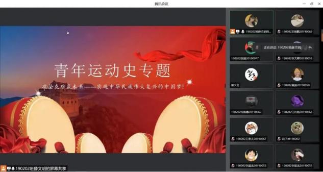 为激发广大团员青年进一步坚定理想信念,激发奋进力量, 4月23日,190202团支部组织全班在腾讯会议开展了线上“党的青年运动史”专题学习,一起重温青年运动史,体会不同时期中国青年运动华章。