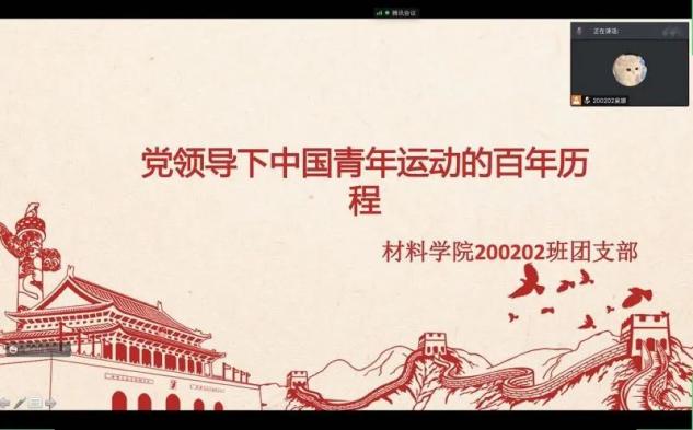 在建团一百周年到来之际,为贯彻新时代中国特色社会主义思想,疫情防控条件下,2022年4月23日,yl9193永利集团200202团支部与腾讯会议的方式举行了“党领导下青年运动的百年历程”主题团课。