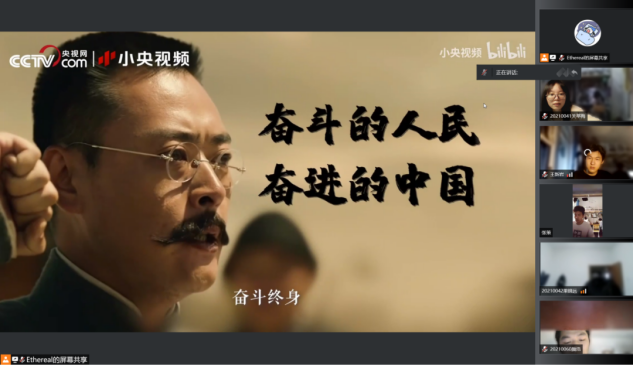 视频结束后,由刘达权,高忠义,谢燚3位同学发言,详细介绍了青年运动史中的早期青年团组织的诞生,中国社会主义青年团的创建,青年抗日救亡组织在反侵略战争中成长三个专题。同时邀请了陈晨发言,讲述了对此介绍的党领导下的青年运动史专题的感悟:在中国共产党直接领导下,中国共产主义青年团成立。100年栉风沐雨,共青团始终坚定不移跟党走,团结带领共青团员和广大青年前赴后继、勇当先锋,书写了中国青年运动的华章。