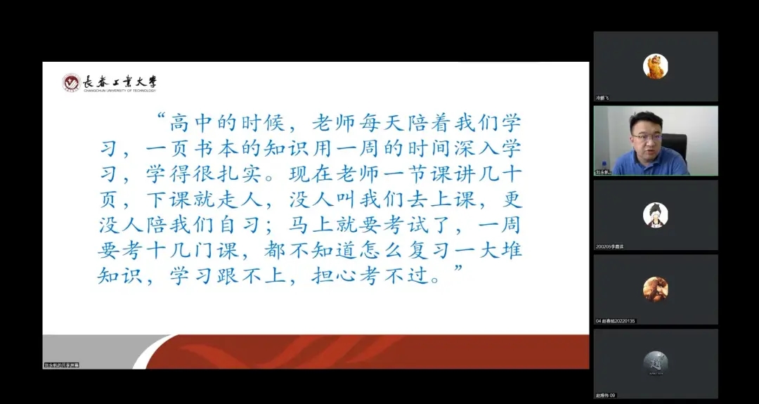 会议中党委副书记刘永帆向大家介绍了在学习方面,要从被动走向主动,在人际交往方面,要尽量融入新集体,在集体生活方面,要提高自理能力,在学会寻找外部力量的同时,要培养自信心。