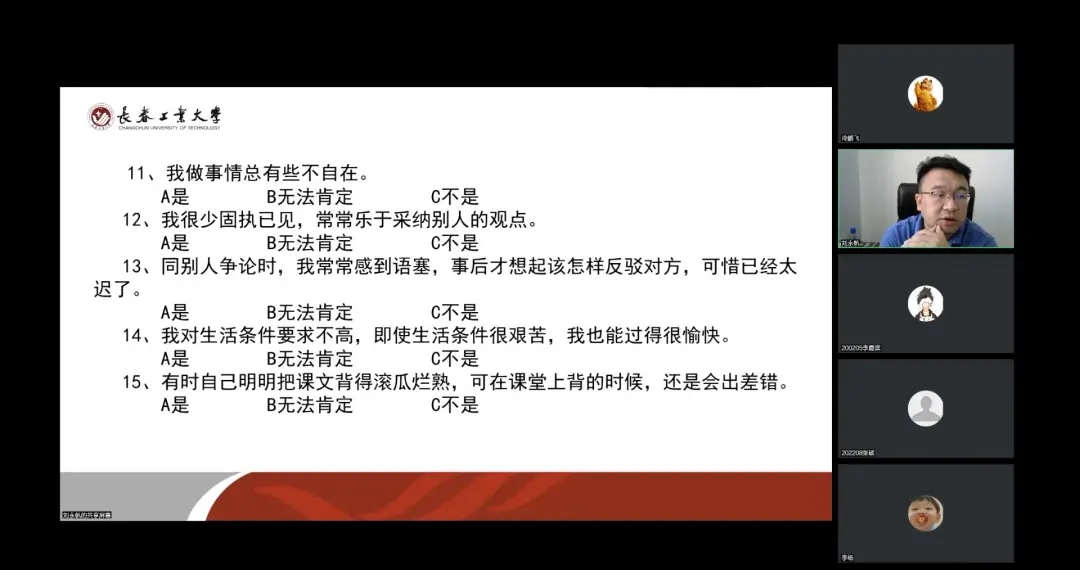 在会议中,党委副书记刘永帆首先通过心理适应能力自测问卷,从侧面反馈出心理活动,帮助同学们进行心理实验能力的自我辨别。其次介绍了大学生活转变,并与同学们进行了一些沟通和探讨。