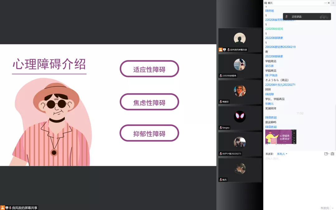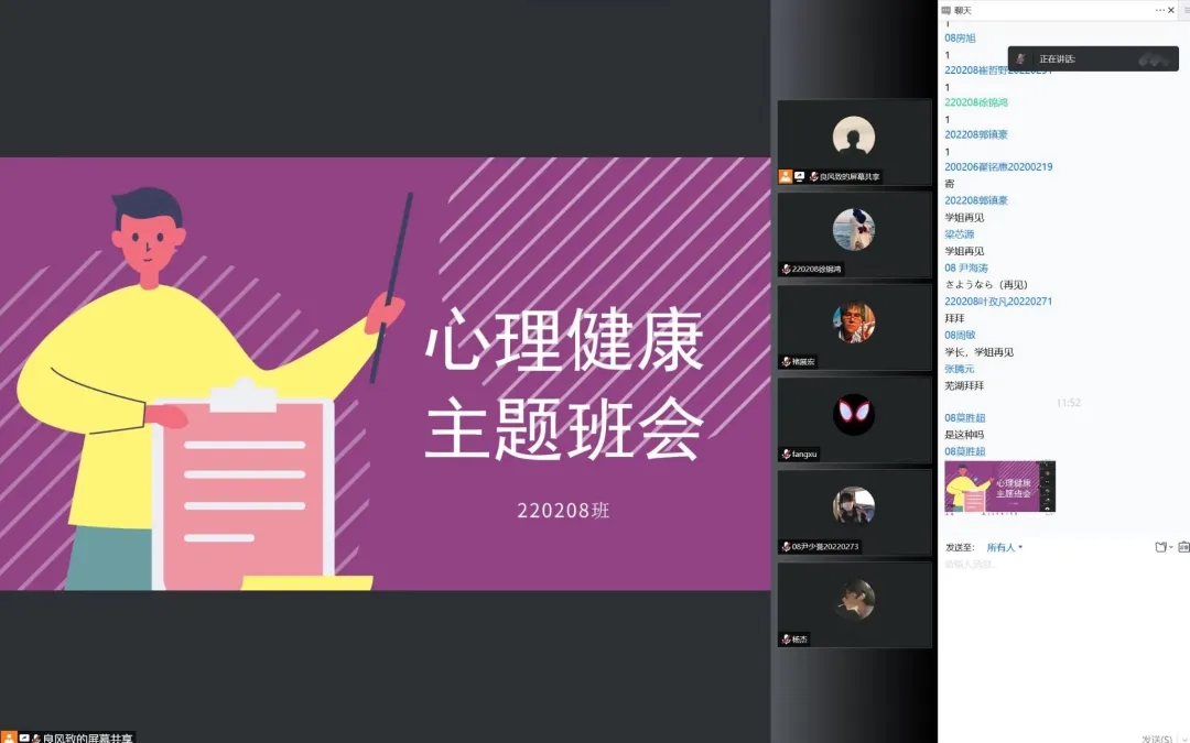随后220209班唐春峰同学播放材料学院17级学长演的心理剧视频。带班学生王磊对今天的会议做出总结,并希望大家注重心理健康问题。