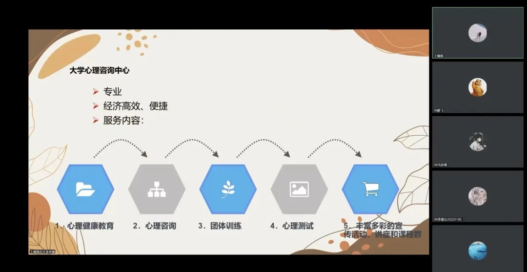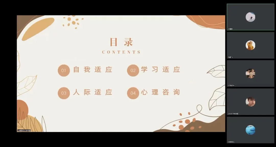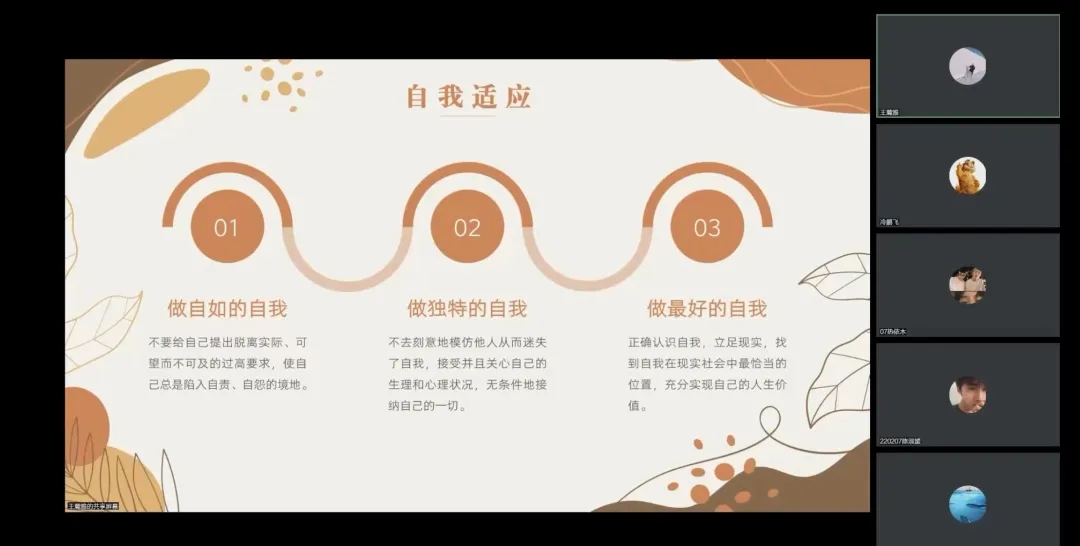 王麓雅老师从四个方面分别讲述了同学们在大学期间可能产生的心理健康问题,并帮助同学们找到适合自己的解决办法。