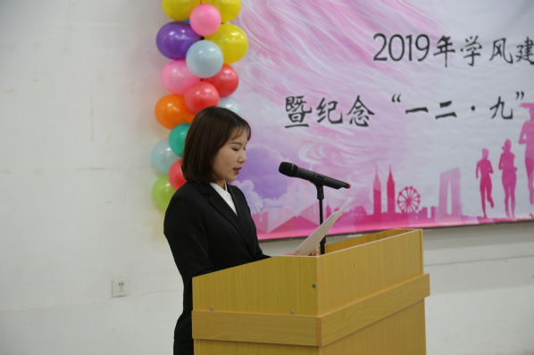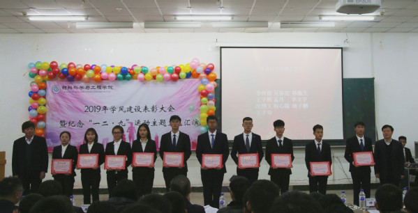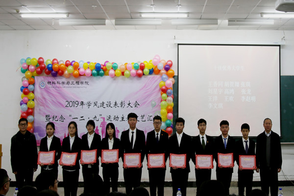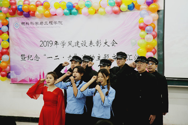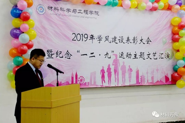 本网讯(通讯员宫悦 孙竞峰)2019年12月8日13点30分,yl9193永利集团在北湖校区西阶102教室举办学风建设表彰大会暨纪念“一二·九”运动主题文艺汇演。应邀出席本次大会的领导及嘉宾有:校党委副书记孟雷、校党委副书记李雁冰、校教务处处长李万龙、校学生工作部部长周文军、校团委书记仲崇利、校党委宣传部副部长邹绍岩、学院党委书记兰民、院长冉旭 、党委副书记吴文东、副院长刘耀东、副院长赵占奎、副院长韩英、金属材料工程系主任陈华、材料成型及控制工程系主任赵宇、学院全体辅导员及辅导员助理、教师代表、受表彰学生代表及各年级学生代表。本次大会由材料学院团委书记万杨主持。