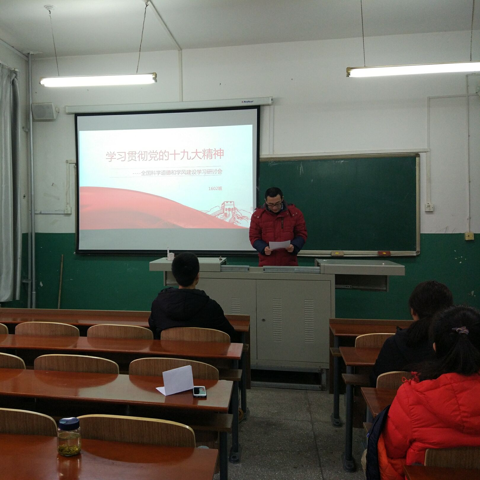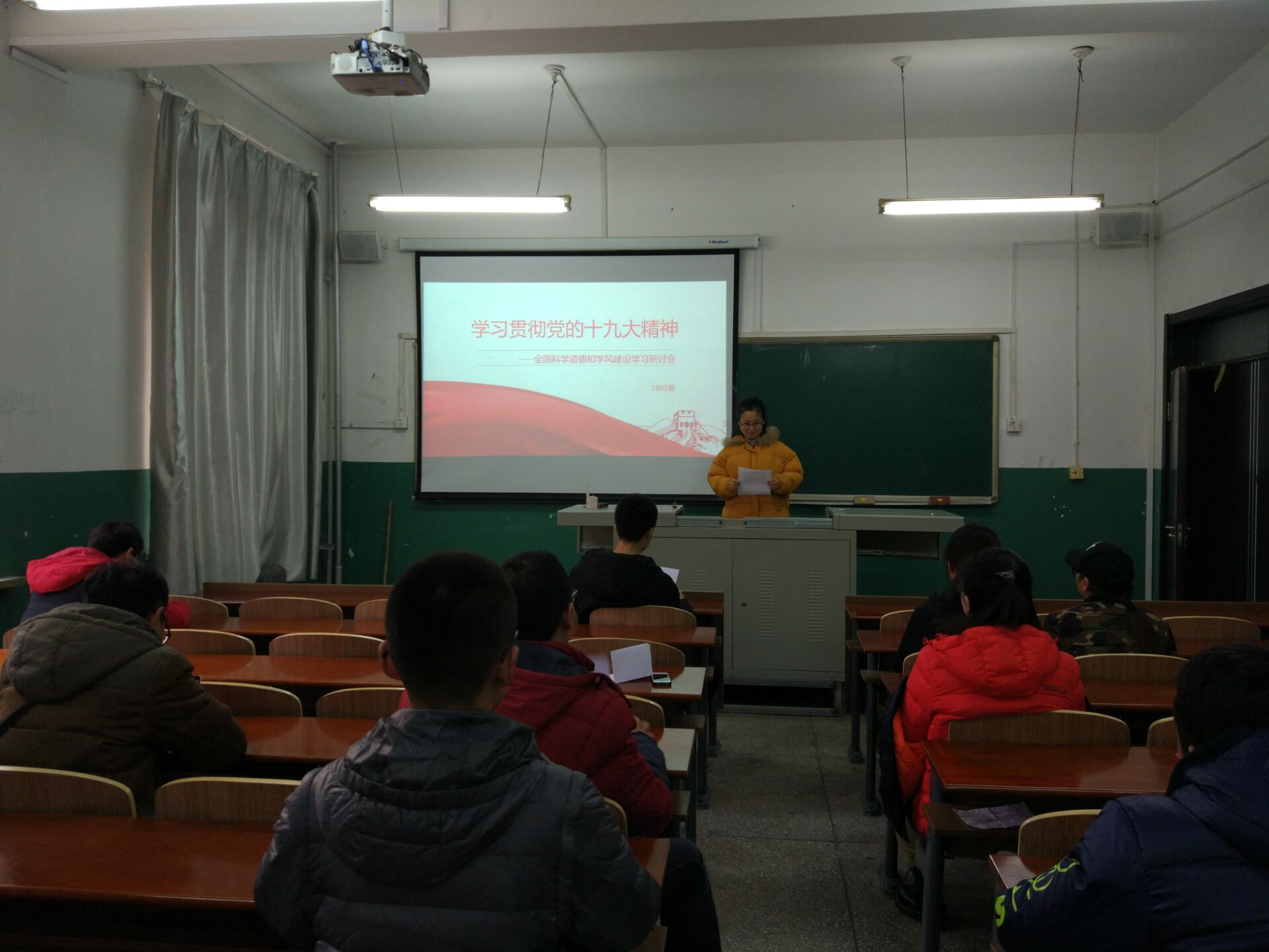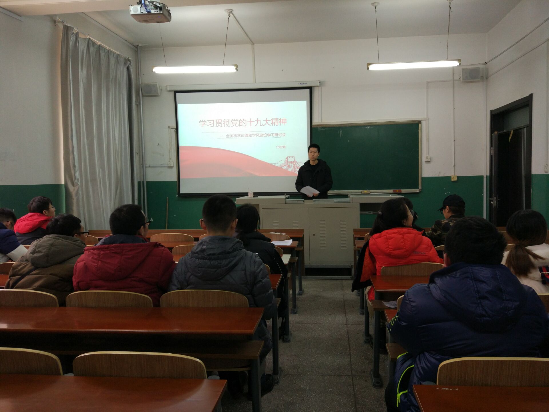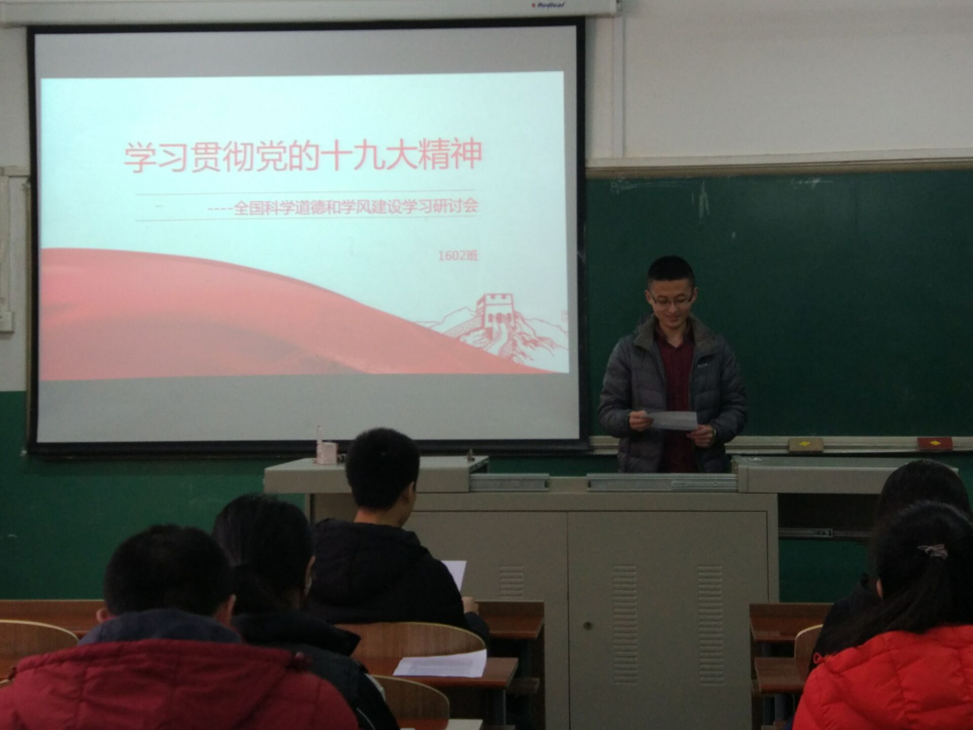 2017年12月7日,研究生201602班党支部再材料楼202举办了专题讲座,201602班全体同学参加了活动,材料科学与工程专业团支书王宇彤,积极分子高大伟、张莹,研究生学生会主席隋小波,研究生团委副主席张上达5位同学做了题为“学习贯彻党的十九大精神-全国科学道德和学风建设学习研讨会”的专题讲座。