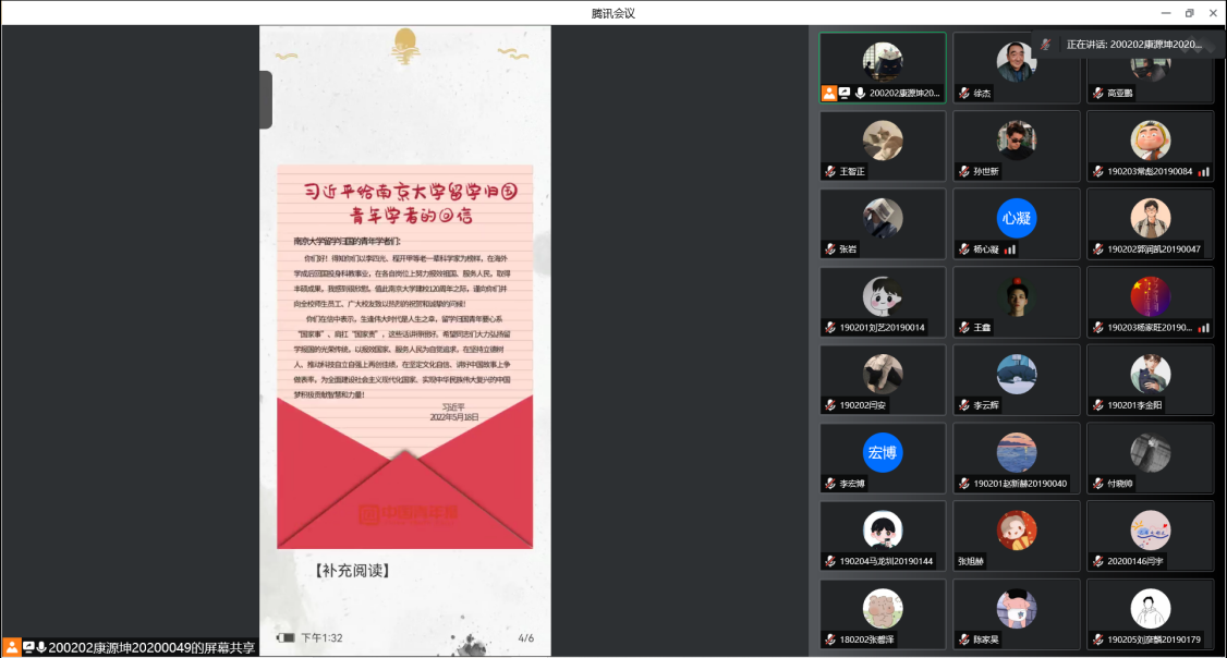 首先,全体学生党员一同阅读了习总书记给南京大学留学归国青年学者的回信。习总书记在给南京大学留学归国青年学者的回信中,勉励归国青年“在坚持立德树人、推动科技自立自强上再创佳绩,在坚定文化自信、讲好中国故事上争做表率。