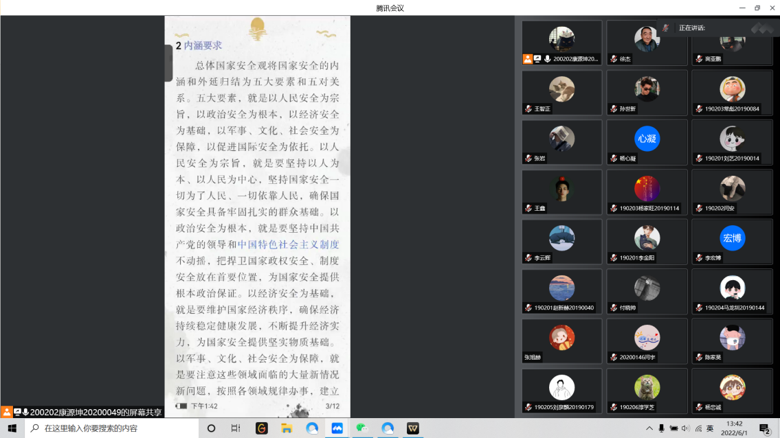 最后,全体学生党员学习了总体国家安全观的相关内容。总体国家安全观是我们党历史上第一个被确立为国家安全工作指导思想的重大战略思想,是中国共产党和中国人民捍卫国家主权、安全、发展利益百年奋斗实践经验和集体智慧的结晶,是马克思主义国家安全理论中国化的最新成果,是新时代国家安全工作的根本遵循和行动指南。