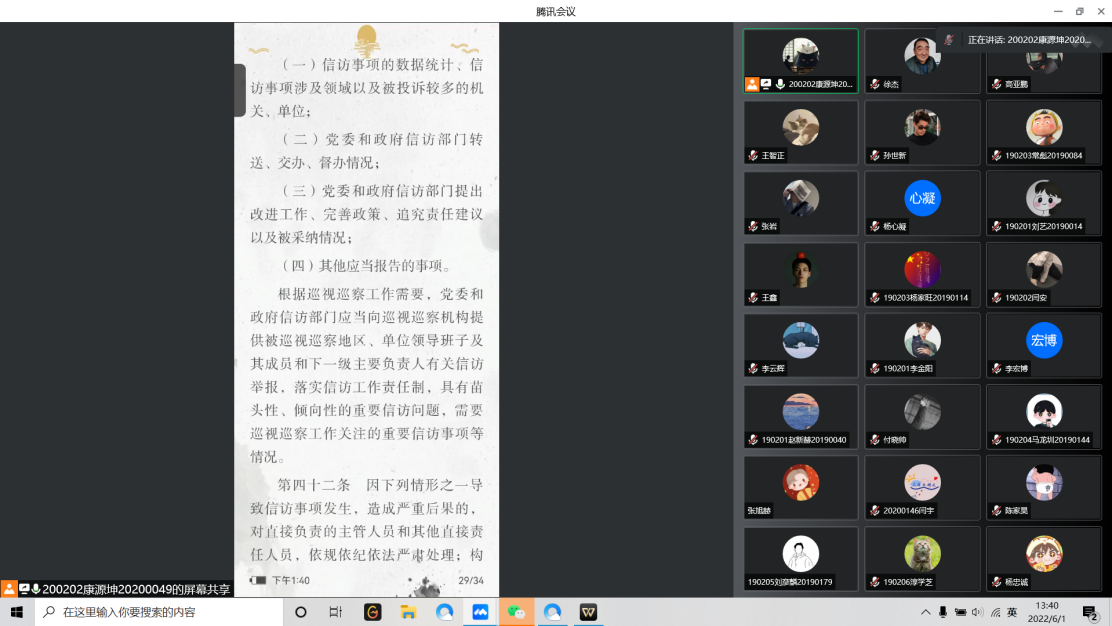 接下来,全体学生党员一同学习了《信访工作条例》。党的十八大以来,习总书记对信访工作作出一系列重要指示批示,系统回答了新时代信访工作一系列重大理论和实践问题,深刻指出了新时代信访工作的本质属性、根本立场、领导体制、功能定位、重点任务、改革方向、方式方法、发力重心、组织保证,是我们党深化对信访工作规律性认识的重大成果,为做好新时代信访工作提供了根本遵循。