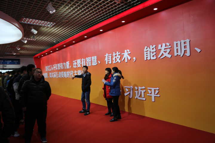 在此次展览中,同学们首先参观了理论学习厅,学习了习近平主席2015年考察吉林省时走访吉林省各大国有企业时所作的重要指示,从内心中领会到“当代工人不仅要有力量,还要有智慧、有技术,能发明、会创新,以实际行动奏响时代主旋律”的时代要求与历史使命。同学们还分别参观了吉林大学、永利官网等校企转化成果展、长春电影制片厂等职工技术创新成果展。在每一个展区、特别是我校展区,同学们都认真听讲解员的细致介绍,不时地对感兴趣的展品与讲解员积极互动。