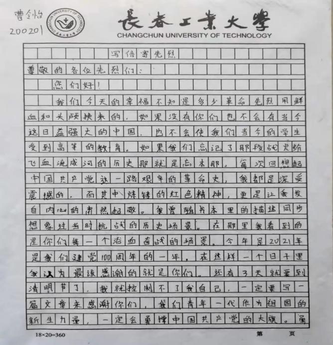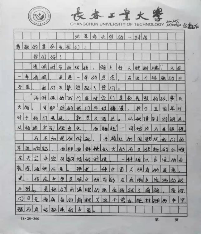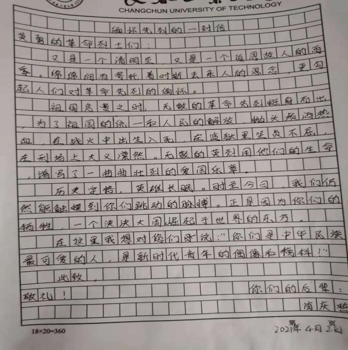 材院网讯(通讯员 丁源浩)为祝贺中国共产党成立一百周年,缅怀为国家奉献生命的先烈们,加强学生红色意识和红色精神。按学校相关要求,材料学院于4月4日开展“写信寄先烈”清明线上缅怀纪念活动。