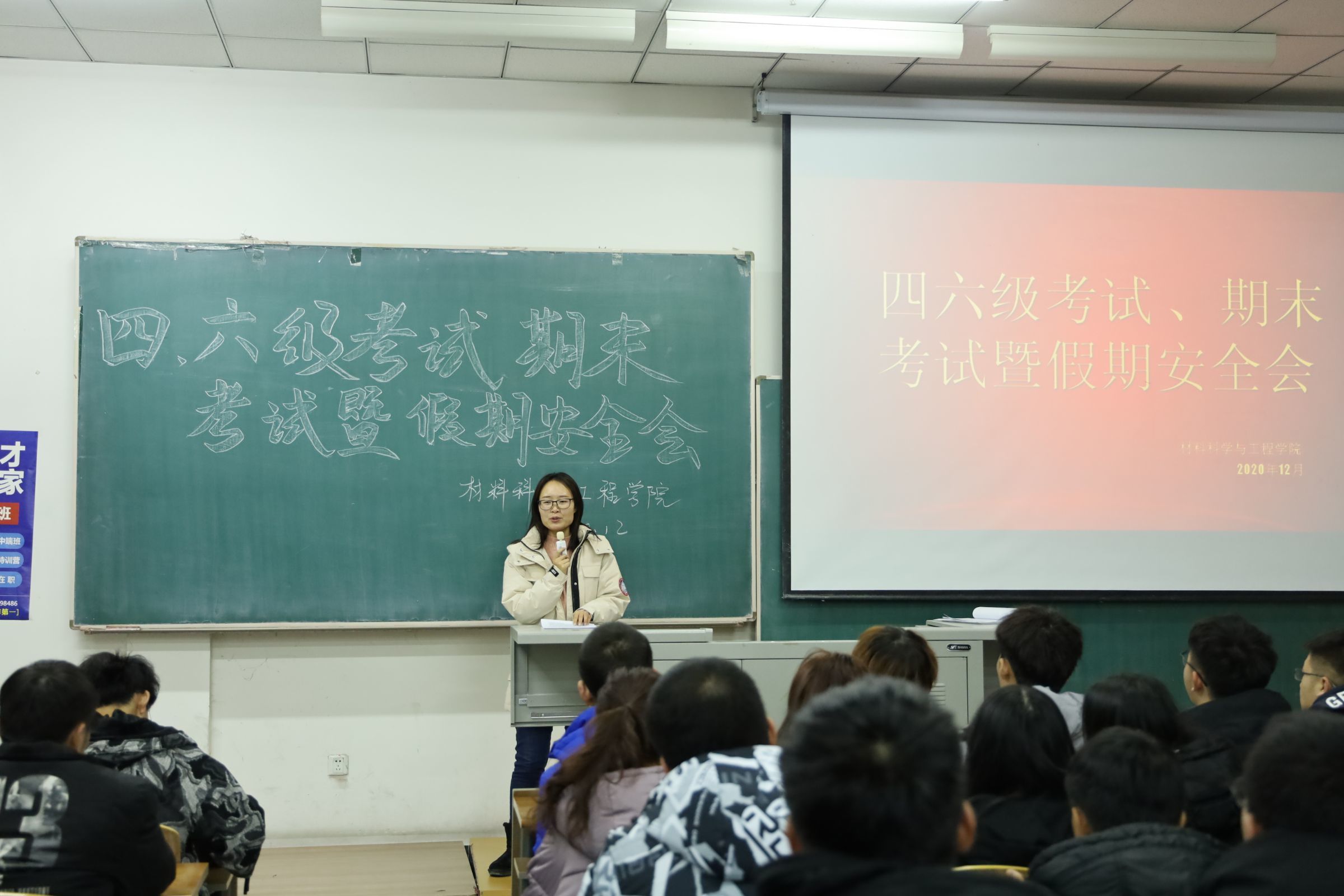 材料网讯(通讯员 宋彤)2020年12月10日下午5点50分,yl9193永利集团在北湖校区主楼1201教室,召开四六级考试期末考试暨假期安全会。19级辅导员李爽老师及2019级全体同学参加了会议。