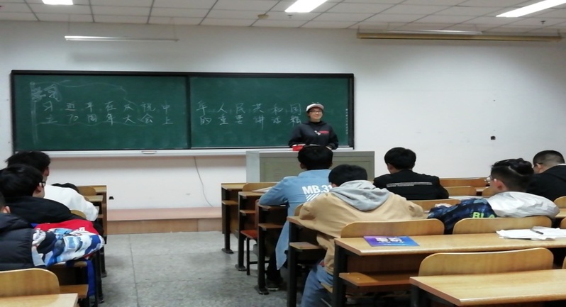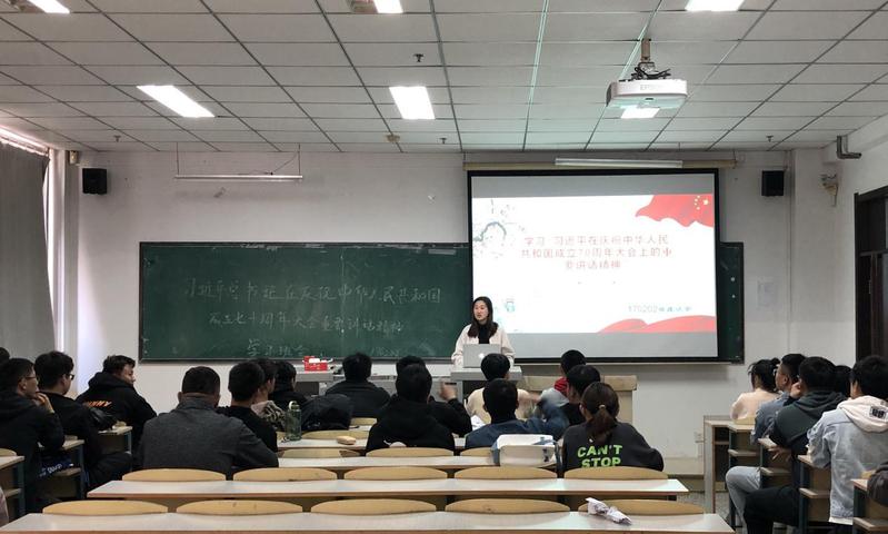 会上万杨带领同学们共同学习了重要讲话精神”,并分享了自己的学习感受,他说到,伟大祖国走过了70年的岁月,走过的道路是艰辛的但是取得的成就是瞩目的,70年来祖国的经济发展、军事实力、生态文明建设、科技发展等都取得了突飞猛进的进步,中国正在从超级大国蜕变成超级强国,希望广大青年学生珍惜青春岁月、不负时代使命,努力学习,用科技武装头脑,用信仰武装灵魂,为祖国的繁荣昌盛做出应有的贡献。
