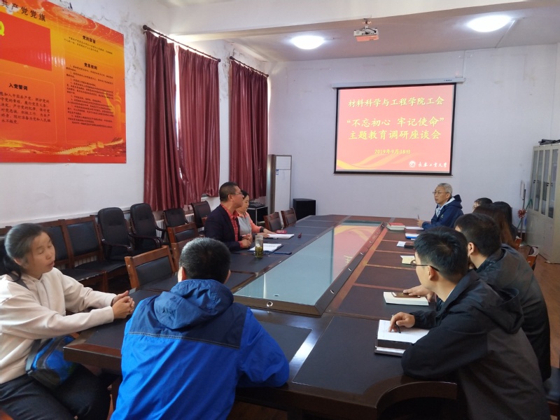 本网讯(通讯员万杨)yl9193永利集团工会于2019年9月19日在材料楼五楼会议室召开“不忘初心 牢记使命”主题教育调研座谈会,会议由学院工会主席吴文东主持,学院各工会小组长、部分教师代表参加了座谈会。