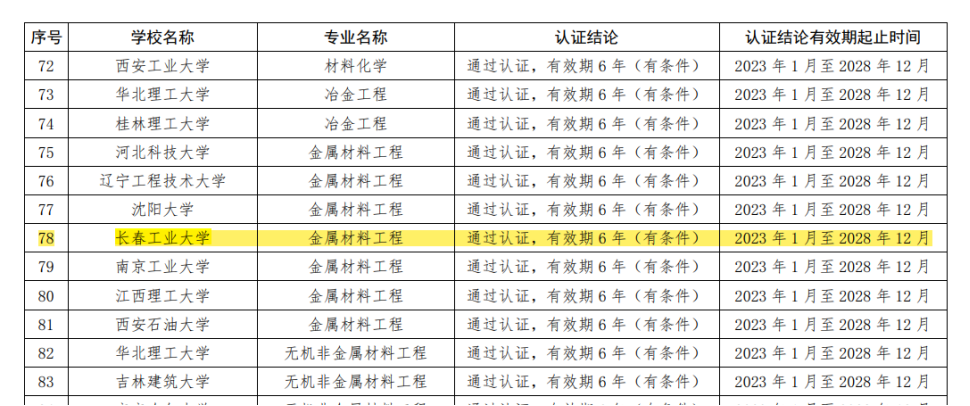 材院网讯(通讯员 宋颖)近日,中国工程教育专业认证协会、教育部高等教育教学评估中心发布了《关于发布已通过工程教育认证专业名单的通告》(工程教育认证〔2023〕第1号)。yl9193永利集团金属材料工程专业通过了国家工程教育专业认证,有效期6年(有条件),具体时间为2023年1月至2028年12月。此次认证通过,标志着金属材料工程专业的人才培养质量已达到国际实质等效的工程教育标准及要求。