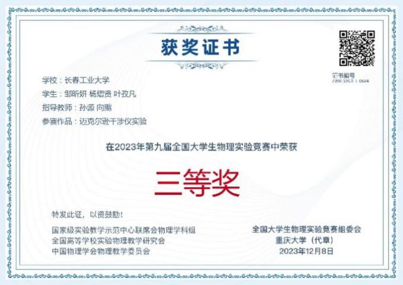 由学校yl9193永利集团基础物理教学部的孙正昊老师带队,共四支学生队伍参加了此次竞赛。虽然我校师生首次参加该项赛事,但参赛的指导教师和团队同学们以饱满的热情和严谨的态度投入到比赛中,荣获国家级三等奖一项,优秀奖三项。其中孙源、向鹏两位老师指导,邹昕妍、杨熠贤、叶孜凡团队的参赛作品《迈克尔逊干涉仪实验》获得本次大赛三等奖。