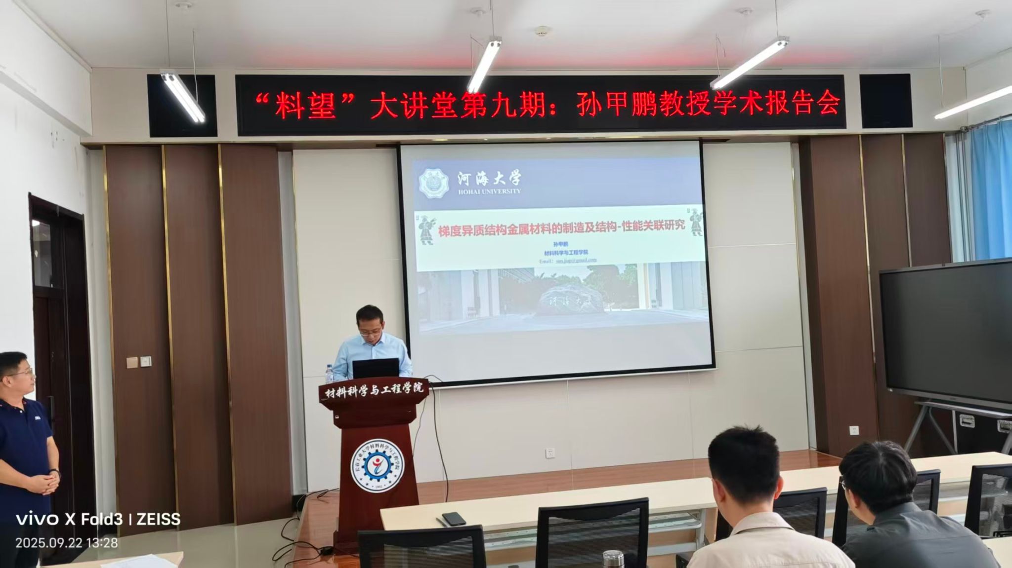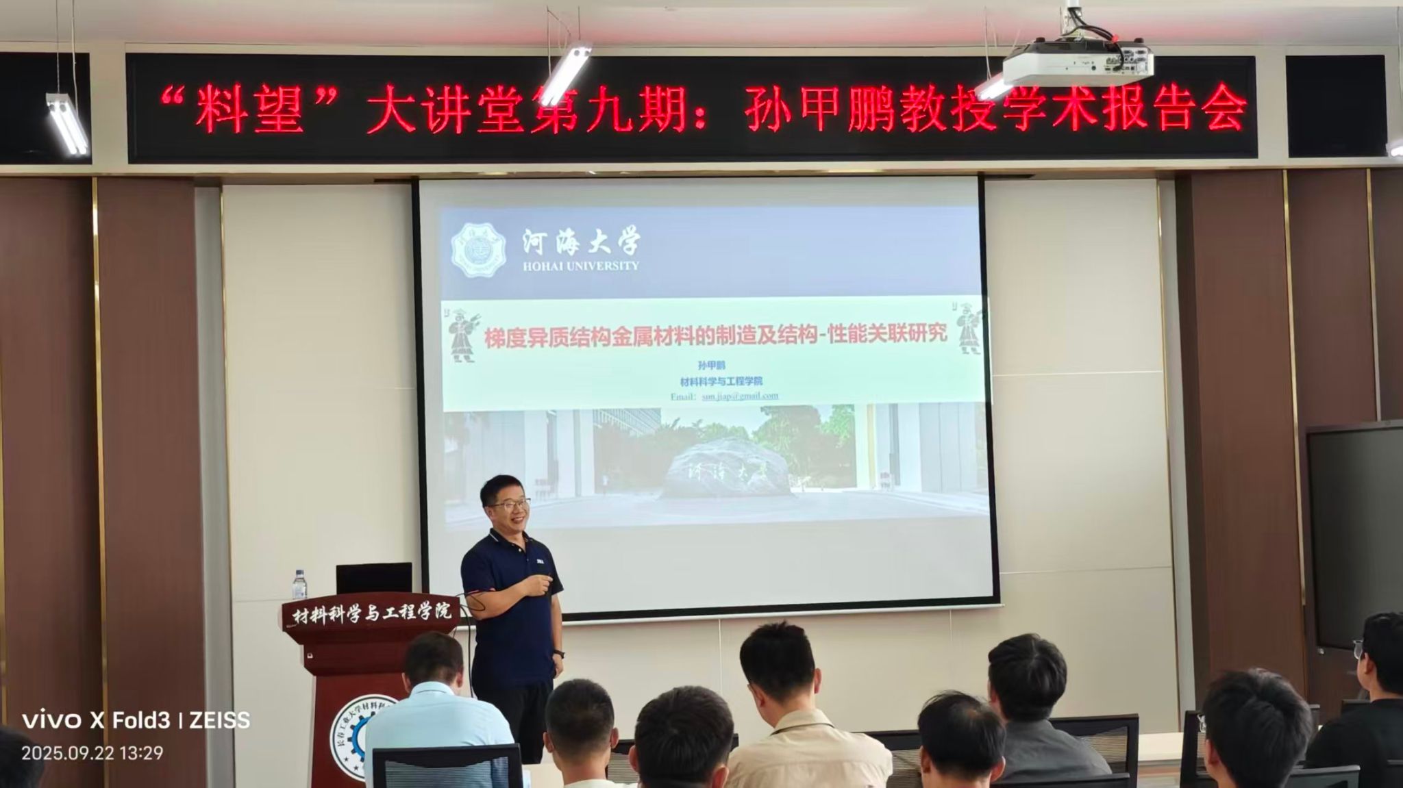 本网迅(通讯员 李宝)汇聚大师,立德树人,传播优秀学术成果,开阔材料研究视野,促进材料学术交流,提升科研及学科建设水平。9月22日下午,yl9193永利集团“料望”大讲堂系列学术报告第九期在材料楼417会议室举行。特邀河海大学大禹学者、硕士生导师孙甲鹏作专题报告。报告会由朱巍巍副院长主持,学院领导、青年教师、研究生参加了报告会。