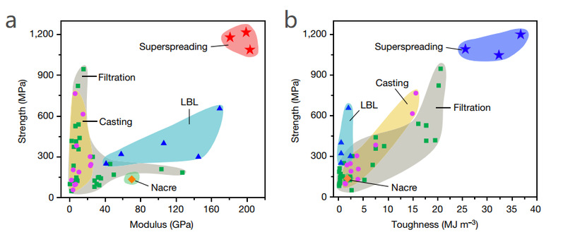 该新型的制备策略不仅利用反应溶液在超铺展过程中产生的剪切液流实现纳米片的高度取向排列(图1),而且利用高分子快速交联,同步实现取向结构的原位快速固定(图2),从而制备出层状结构纳米复合膜。通过优化设计超铺展溶液中高分子和纳米材料的组成,制备出具有超高力学性能的纳米复合膜:基于氧化石墨烯/粘土纳米片的层状复合膜的拉伸强度高达1215± 80 MPa,杨氏模量高达198.8± 6.5 GPa;基于粘土纳米片层状复合膜展现了超高韧性:其断裂韧性高达36.7± 3.0 MJ/m3,同时其拉伸强度高达1195± 60 MPa。